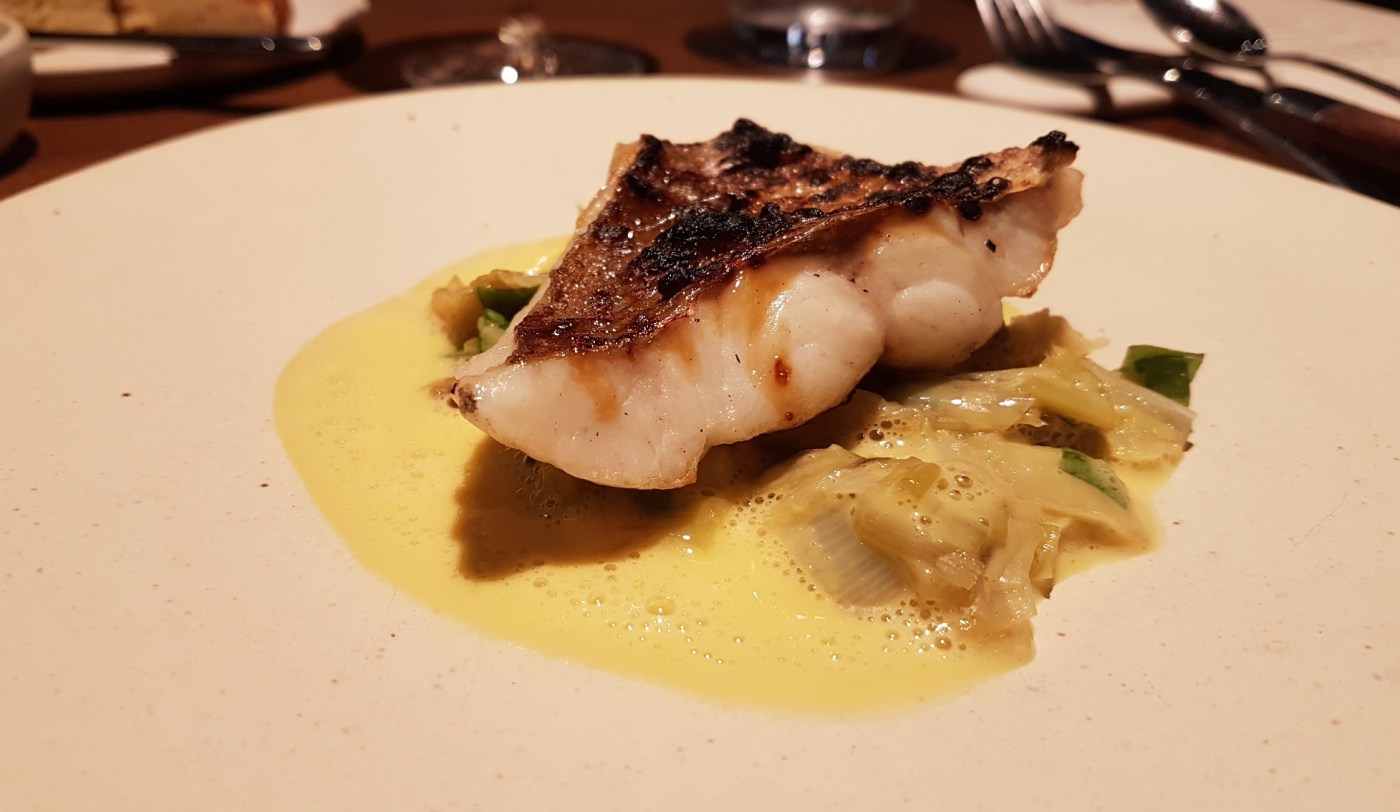 Primeiro. Na ausência de amuse-bouche, Landgraf mostra todas as cartas da mão já no primeiro prato: cherne, vinagrete de alga, óleo de kombu e pinole. A garoupa é delicada em sabor e textura, suas companhias a reverenciam com elegância, harmonia e suavidade. Apenas três elementos, muitas camadas de sabor: óleo amanteigado, vinagrete ácido, frutado e herbáceo (riquíssimo, um caldo de vegetais fermentado?, há também uma pungência que me remete a tucupi), umami da alga, crocância, terrosidade e tostado do pinole. Nível? Prato-assinatura de um três estrelas. Expressa identidade sem deixar de ser universal e atemporal. Mesmo sem os 3 gramas complementares de caviar Giaveri Ossetra (me doeu rejeitar, tenho certeza de que valeria os R$95, mas era fim de mês… terei de voltar) é complexo e objetivo, inteligente e tocante.