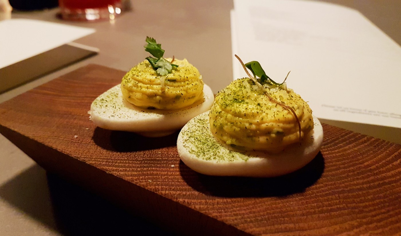 O primeiro prato é um ovo endiabrado. Não, espera. Aperto os olhos e me aproximo na meia-luz. Não é um ovo. Mordo e descubro que a “clara” é um suspiro bem doce, bem ácido e bem crocante. A “gema” é um creme de gemas bem salgado e apimentado. Então, sim, é um ovo, um ovo desconstruído. A “clara” ainda é a clara, mas modifica para ser crocante, cítrica e doce; a “gema” ainda é gema, mas cozida lentamente para ficar cremosa e salgada para acentuar o sabor delicioso de uma boa gema. A combinação contrastante de gostos (sal, doce e ácido), aromas (cítrico e gema) e textura (crocância e cremosidade) deixou meu queixo no chão. Delicioso, divertido, inteligente e muito barato. É o começo perfeito, representa o que vem pela frente com potência, fanfarra e confete.