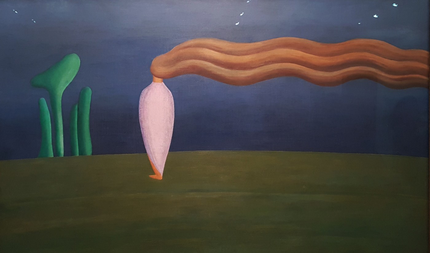 Figura só (1930) é de força infinita. Como explica um dos seis comentadores convidados para escrever sobre as obras, a família de Amaral vai à falência com a crise de 1929, perde representatividade política com a Revolução de 1930, Oswald de Andrade troca Amaral por outra mulher e a pintora ainda perde seu cargo na Pinacoteca de São Paulo. Esse é o único quadro que ela pintou nesse ano. A figura é um totem monolítico, uma lágrima, um botão de flor que se fecha. O verde e o azul são sóbrios, formais, melancólicos. Os cabelos, infinitos, esvoaçam para fora da tela como se não fossem matéria. E a vegetação, que faz ali? O quadro não seria mais dramático sem ela ali? A figura não deveria estar sozinha, como diz o nome? Provavelmente. Mas lá estão as plantas. Acredito serem importantes para nos remeter imediatamente à Amaral. Nelas estão sua autenticidade, sua assinatura, sua criação, sua obra. E se essas figuras surrealistas são ícone de sua obra, nos remetem a sua obra, será que não representam literalmente sua obra? Só lhe resta sua obra, só lhe resta a pintura. Significa que ela não está sozinha então? Não, ela continua sozinha, porque sua obra é sua extensão, sua obra é parte dela.