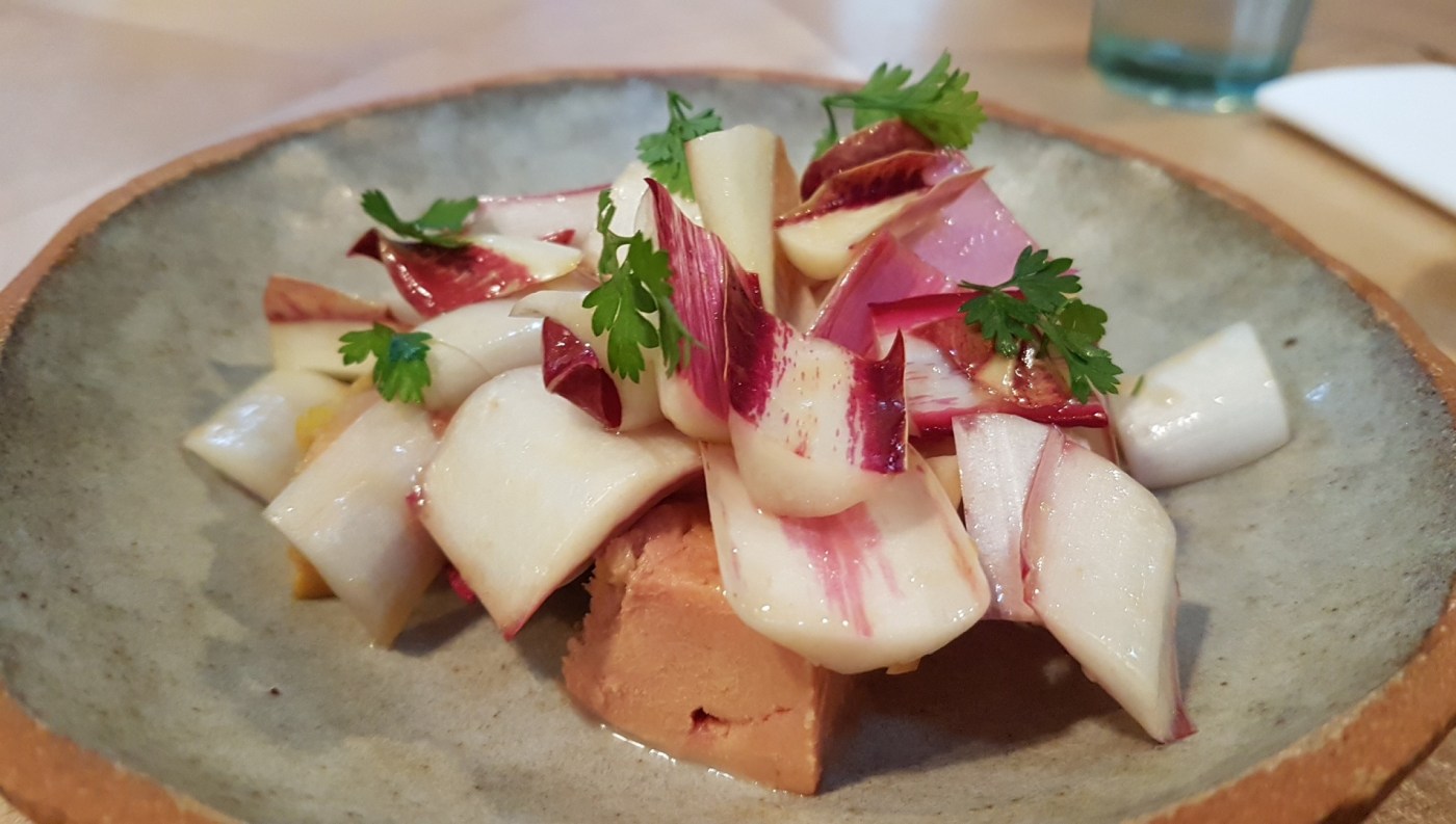 De entrada, o grão-de-bico é ao mesmo tempo firme e macio, tem pimentas aromáticas e um surpreendente tofu borrachudo e defumado. Outra entrada tem radiche espantosamente doce e crocante, gomos de tangerina intensos e ácidos, e cubos de foie gras que derretem na boca. Bom foie gras (raro) é o equivalente salgado do bom chocolate (raro). A tangerina é como um cupido que faz foie gras e almeirão, texturas tão contrastantes, serem felizes para sempre. Fecho meus olhos e murmuro de prazer (raro).