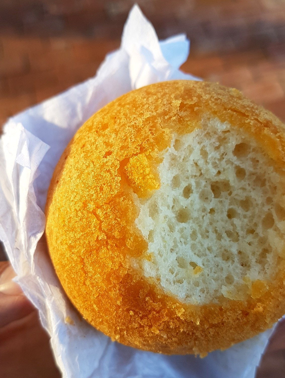 Seis da manhã, eu passava pela cinzenta Carreira 68 de Bogotá. Uma cafeteria movimentada me chama a atenção, eu resolvo arriscar e pulo fora do ônibus no próximo ponto. Fico encantando com o dourado vibrante da crosta e a elasticidade infinita do interior esponjoso da buñuela. Os chiffons japoneses babam de inveja. É preciso que a temperatura do óleo esteja certeira para conseguir essa crosta magnífica e um cozimento tão homogêneo de uma bolota enorme dessas. O pandebono choca um brasileiro desprevenido pela doçura e acidez. Um pão de queijo que combina o máximo da textura úmida e pegajosa do polvilho doce, com o máximo de aeração e acidez do polvilho azedo. Num forno bem quente, fica dourado em cima e embaixo, o tempo encurta, o interior não resseca, o sabor de queijo continua presente e agradável. Todo mundo só fala de receita e ingredientes secretos, mas muitas vezes o que torna a comida extraordinária é o cuidado com a temperatura do óleo e do forno. Comida de rua boa assim restaura minha fé na humanidade, nem tudo está perdido.