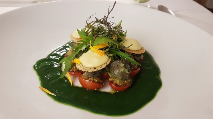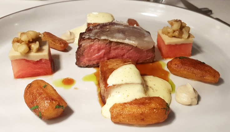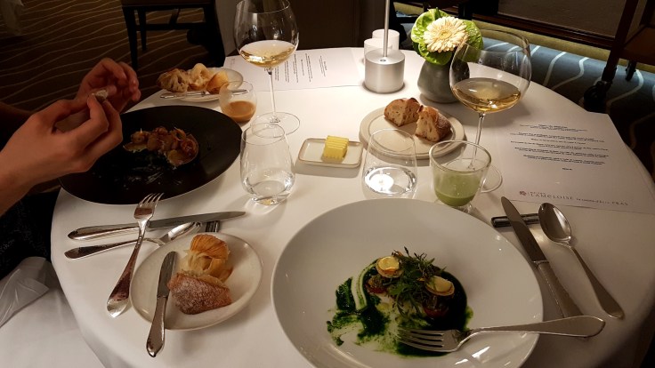 Ainda bem que minha alergia me faz rejeitar a finíssima sablé com lagostins frios, gravlax de féra (um extinto parente do salmão cujo nome continua sendo usado para vender outras espécies salmonadas do lago Léman), gema confit e granita de peixe; pois acabo com os suaves, ligeiramente borrachudos e deliciosos caracóis com tomates hiper doces, frutados e recheados com pistaches. A salada, o coulis de salsinha e as torradinhas com sabayon de açafrão não somam, nem subtraem, fazem volume. No principal, somos cobaias de um mar e terra ainda em criação: contra-filé, barriga de atum, “caviar” de berinjela, batatas defumadas, melancia e sabayon de pimenta de cassis. As carnes conversam, a melancia alivia o peso do prato, só falta acertar a apresentação.