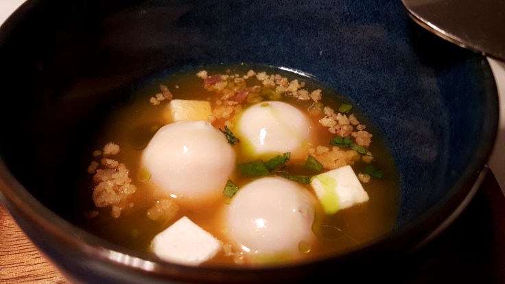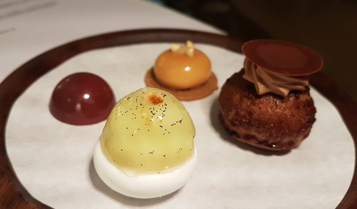 Os amuses-bouches da Maison Lameloise em Chagny são amusants e recreativos, no caso, inspirados num recreio mesmo: “bille” (bola de gude) de gaspacho doce e ácido, muito frutado, aroma de morango; “sucette” (pirulito) de manteiga de cacau, foie gras e cassis, os dois primeiros derretem na boca em sincronia; biscoito de Comté, creme de alecrim e rillete de truta; sanduichinho de Judru e rabanete. De entrada, as bolas de melão cobertas em leite de cabra vêm em redução de melão, queijo fresco, prosciutto e menta. É refrescante, leve, sem adição de açúcar, tem pouca acidez e suave retrogosto de cabra. O chefe de cozinha, Eric Pras, não busca intensidade desde o começo: afagos e beijinhos primeiro, por favor, obrigado.
