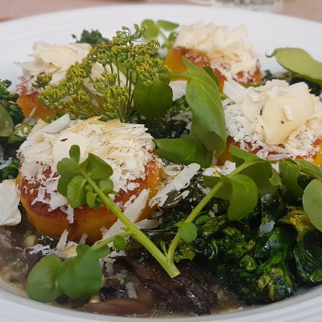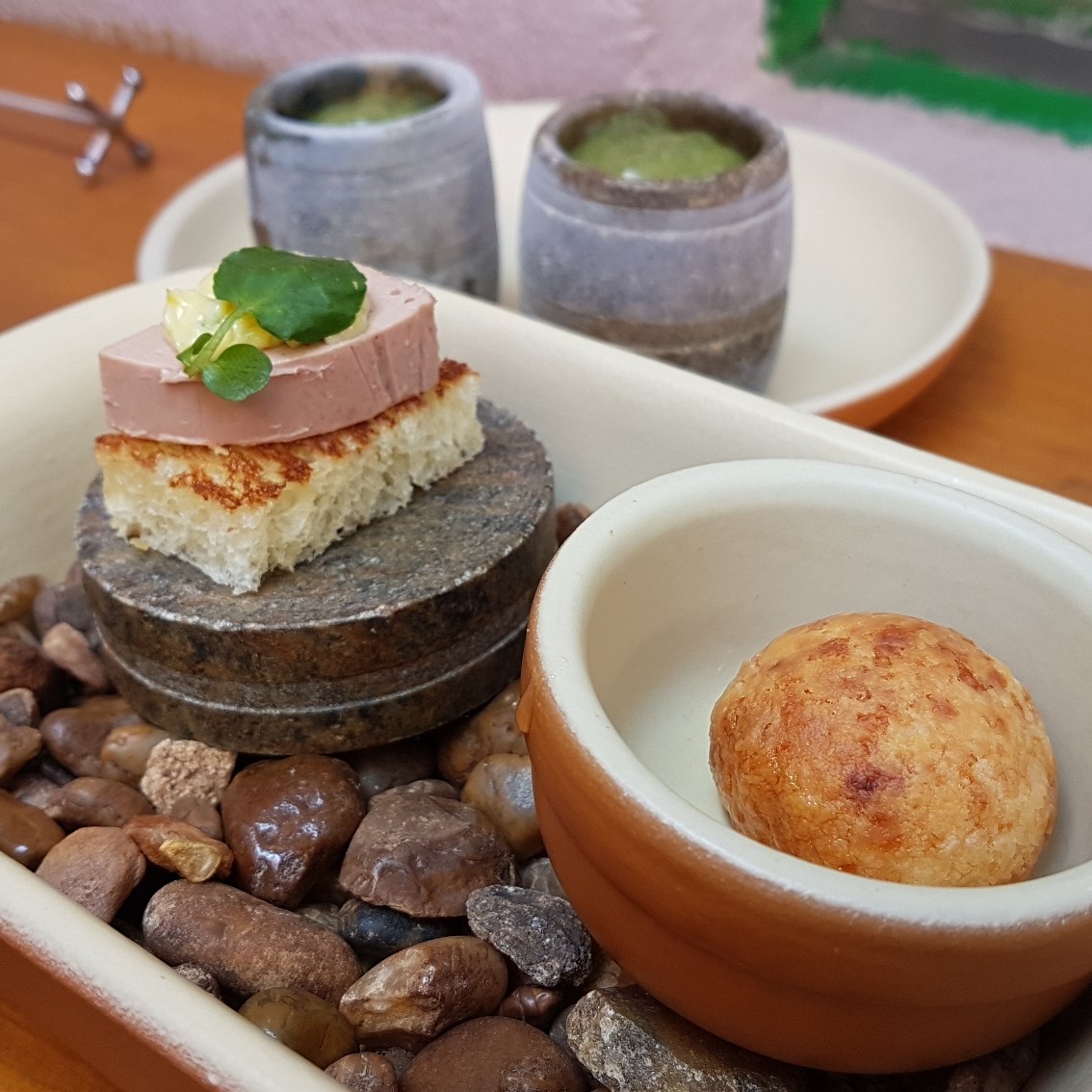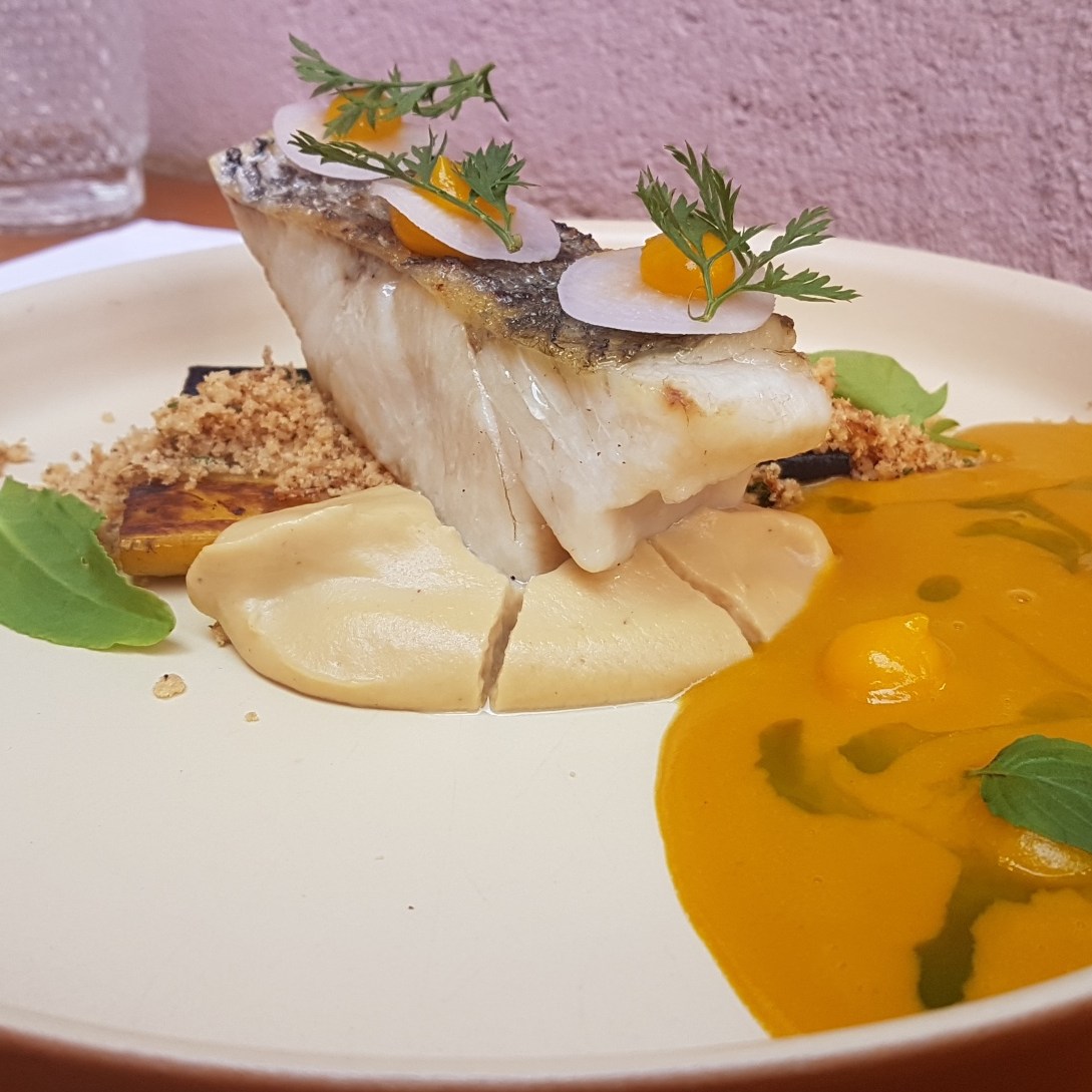 O AE! Cozinha começa a mil por hora; as entradas são complexas, interessantes e prazerosas. Uma dose potente do que eu chutaria ser limão, couve, gengibre e água carbonatada era, na verdade, água de coco, trevo e uva verde no sifão. Contraste perfeito entre exterior crocante e interior pegajoso, o pão de queijos Trilha e parmesão tem sabor equilibrado entre polvilho e queijo, e é divertidamente lambuzado com mel de jataí azedinho e floral. Um brioche fresco, rico e crocante é veículo para o parfait de fígado de galinha leve como uma nuvem. Acompanhado de “vinagrete” de avelã, alho-poró grelhado e maionese com ostra, o iogurte faz o cérebro puxar o “tartare” de beterraba para frutas vermelhas. O “pesto” de abobrinha surpreende com o corpo de guacamole e, junto com a bottarga defumada, o “carpaccio” de abobrinha e a conserva de chalota, eclipsa a pupunha assada ao dente.