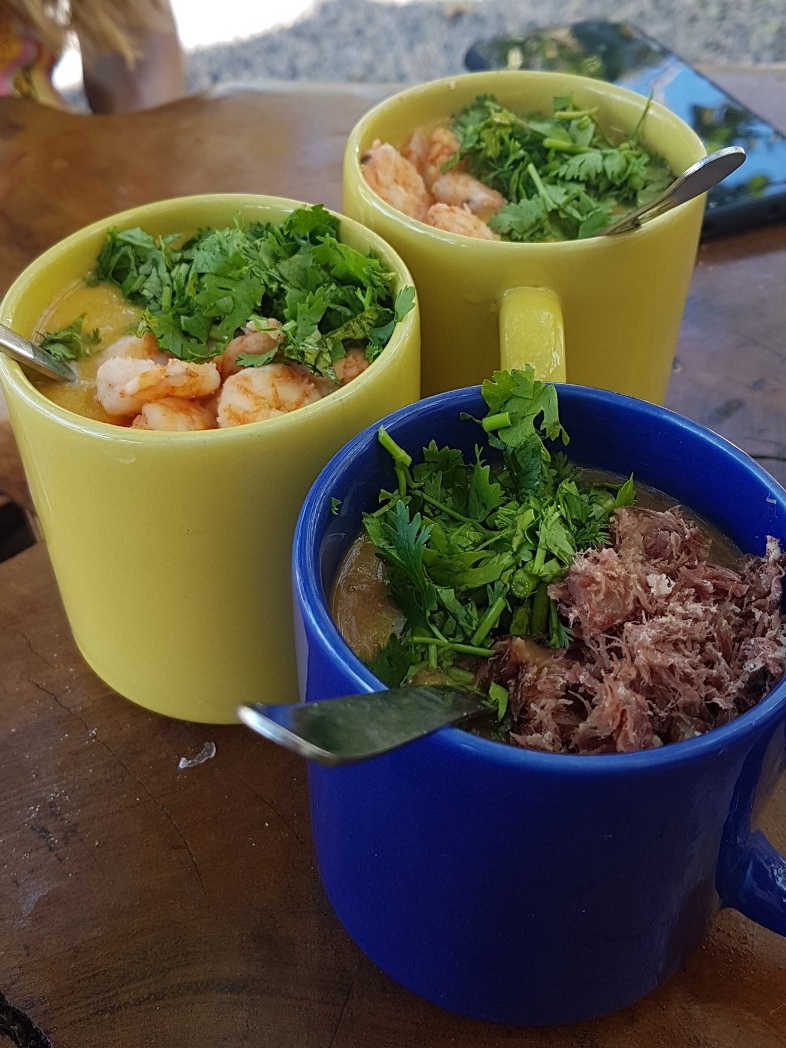 Colocamos nosso nome na lista e sentamos nos banquinhos da fila de espera. Podemos pedir algumas bebidas e caldos enquanto esperamos por uma mesa, e assim o fazemos. O caldo de camarão e o de feijão são quentes, encorpados e entregam sabores característicos e intensos, deixando a expectativa para a refeição ainda maior. O jovem e carismático chefe de cozinha Paulo Quintella expressa tendências contemporâneas globais como pratos internacionais feitos com ingredientes locais, nomes pretensiosos, pratos individuais (no Nordeste, o padrão são pratos para duas ou três pessoas) em um menu de três tempos (R$105) e, nas palavras do restaurante, “cozinha autoral” e “sazonalidade”. Alguns minutos depois, descobrimos que estávamos na fila para o Crôa, o bar vizinho do restaurante Aratu em Marechal Deodoro, Alagoas. Os caldinhos não vieram da cozinha do Quintella.