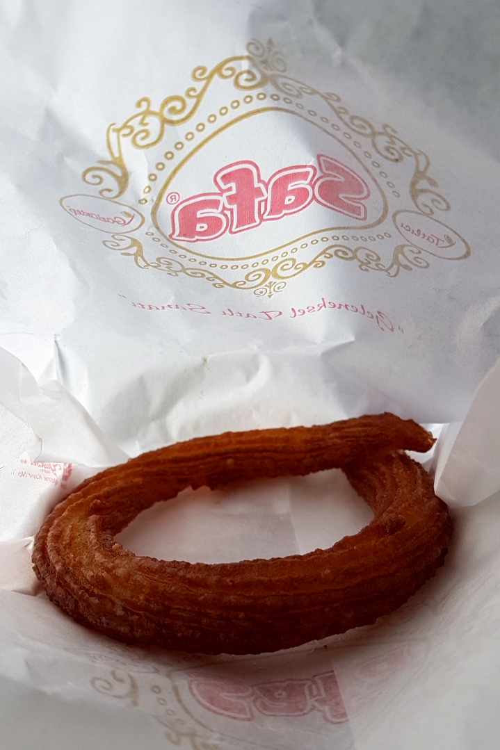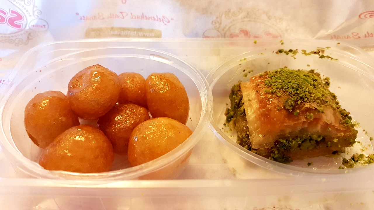 A rede de confeitarias Safa é famosa pelo künefe, um doce que intercala camadas de massa filo e de queijo em um prato fundo levado à grelha até que o queijo derreta. Com a pandemia, o salão estava fechado e eu não quis levar para o hotel e comer frio. Peguei um(a?) halka, pâte-à-choux frita como o churros, e alguns(mas?) lokma, massa fermentada e frita como um sonho. Embora os ingredientes e processos sejam diferentes, o resultado de ambo(a)s é parecido: um exterior glaceado e crocante que explode em calda suavemente aromatizada com o que me parece ser água de rosas e especiarias, mas normalmente é água, açúcar e suco de limão. Também levo um(a) baklava de pistache, massa filo fresquinha e crocante intercalada com pasta suave, equilibrada, docinha e untuosa de pistache. A internet reverbera que os doces turcos são muito doces, mas, como brasileiro, a doçura me pareceu normal. Permito-me repetir o clichê: são perfeitos para balancear a força do café turco.