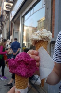 Em 2002, o portenho Alejandro Atampi começou a trabalhar na Cones, uma sorveteria em Nova Iorque. Lá, ele ficou até se apaixonar por uma belga, mudar para Bruxelas e abrir uma filial da Cones próxima ao Étang d’Ixelles em 2018. Ela no caixa, ele no freezer, ambos sem pressa, o dia bonito, a fila se alonga em frente à sorveteria. A @conesbrussels usa creme de leite como base para diversos sabores entre tradicionais e inusitados. Alguns tradicionais são baunilha, flocos, pistache e doce de leite (argentino, claro). Outros, mais ou menos familiares dependendo de onde somos, são beterraba, erva-mate, batata-doce, milho e banana. Uma placa informa: 2,5€ por uma bola, 5€ por duas e 7,5€ por três. Parece que dependendo de onde somos, estamos mais ou menos familiarizados com multiplicações. A Cones se previne.