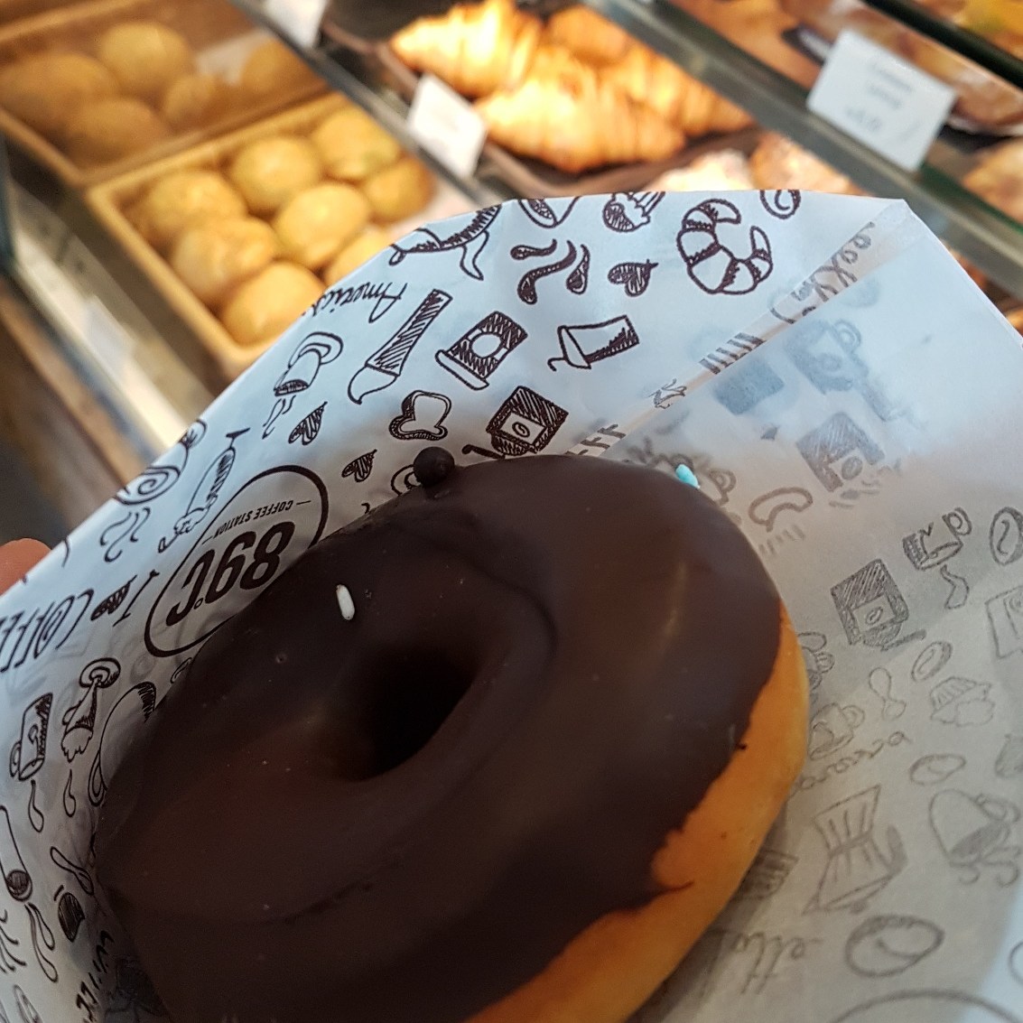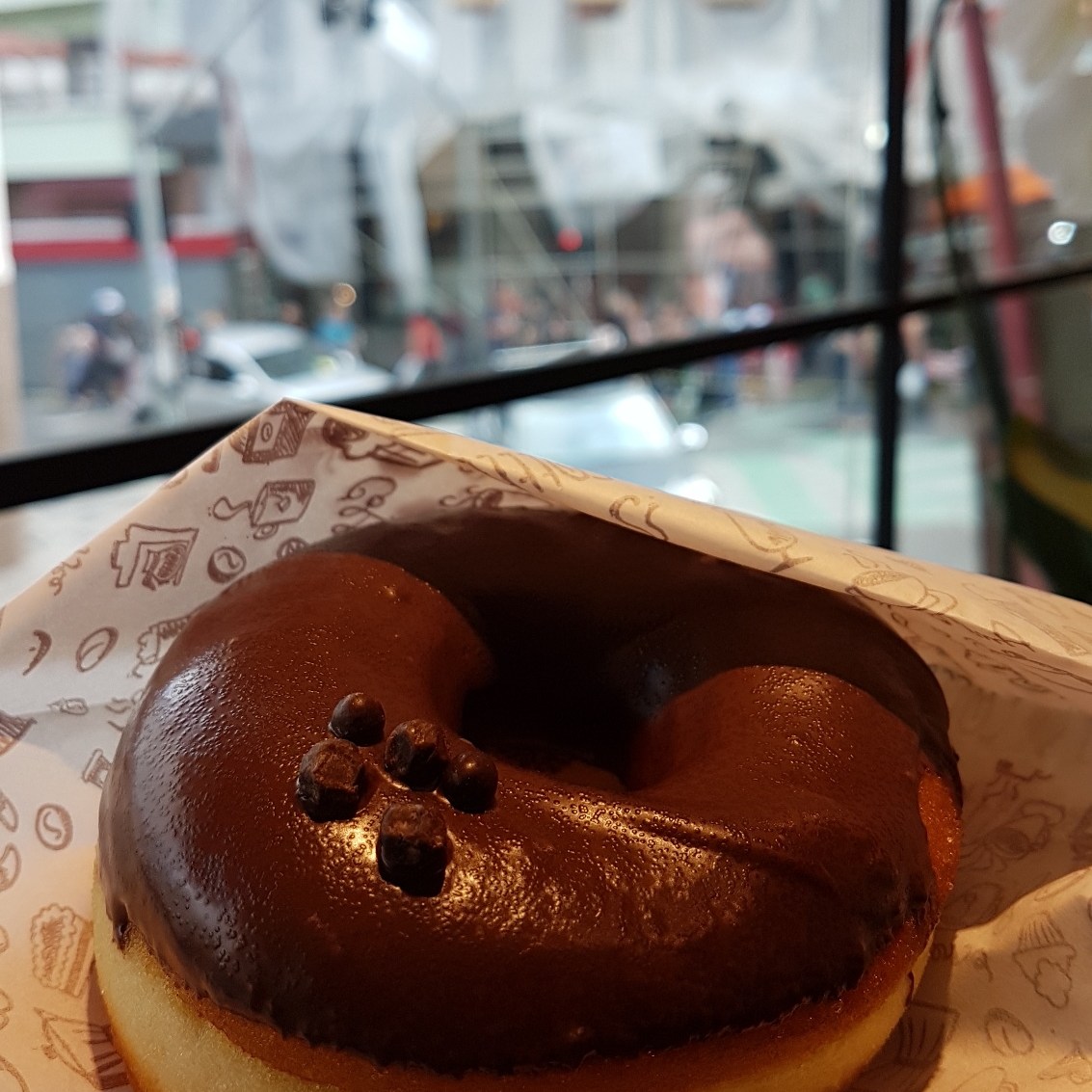 Siga até a 89ºC Coffee Station na Liberdade. Se possível, evite horários de movimento (quase sempre). Também é possível comprar apenas o donut no balcão voltado para a calçada, sem entrar na loja. Se entrar, ignore todo o balcão logo em frente, vire à esquerda e peça seu café. Há espressos e coados, prensas e sifões. O grão varia ao longo dos meses e anos, parece nunca ser o mesmo. Seja variação de safra, varietais ou fornecedores, raro ser extraordinário, raro ser ruim. E está tudo bem, é só um cafézinho. Enquanto fazem o café, vire 180º e atravesse para o balcão atrás dos caixas. Peça um donut com cobertura de chocolate belga. A massa é elástica, bem fermentada, alvéolos alongados, cozida perfeitamente, uniforme e sem ressecar. A cobertura de Callebaut 50,7% ou 54,5% tem um pouquinho de acidez, doçura e frutado, quase nada de amargor. Vai muito bem com a massa, come-se tudo sem enjoar. Também pode pegar o com açúcar e canela para casar com o café. Nenhum outro. Ah, o preço? R$7.