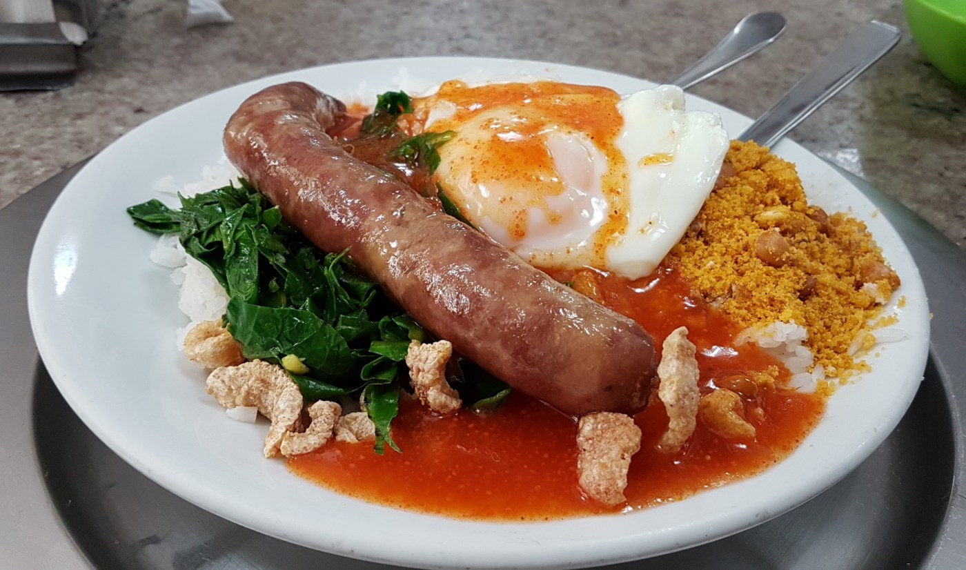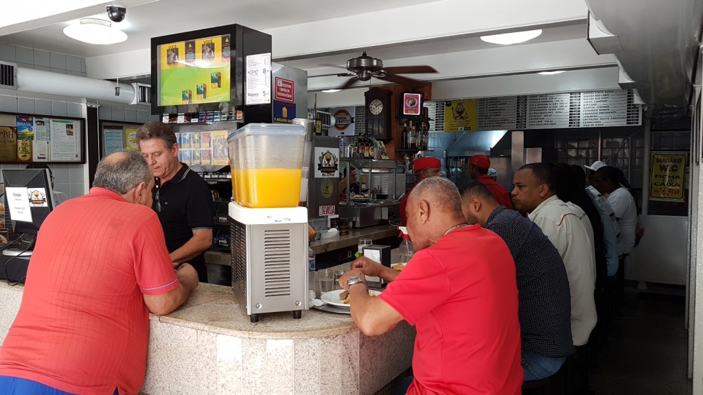 Se parecer estranho montarem seu prato em um minuto, entenda que numa cozinha profissional são (teoricamente) 6 horas de preparo para 2 horas de serviço. Tudo (teoricamente) precisa estar pronto para a correria do almoço ou jantar. Por isso, o tempo que um prato demora para ficar pronto raramente está relacionado ao frescor da comida, só lugares e malucos muito específicos fazem comida do zero sob demanda. Esse tempo, então, está mais relacionado à organização e à precisão da equipe, à adequação do cardápio à estrutura e aos processos do lugar. No Palhares, também ajuda que a rotatividade seja alta (come-se em quinze minutos) e que os cozinheiros já saibam o que vão servir ao próximo que sentar: couve viçosa, ovo bem ou mal passado, torresmo crocante e molho para umedecer e saborizar a farofa e arroz frescos. Isso é priorizar qualidade à variedade.