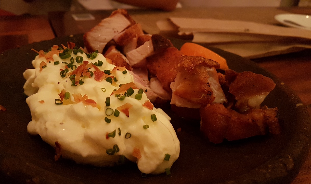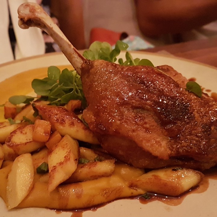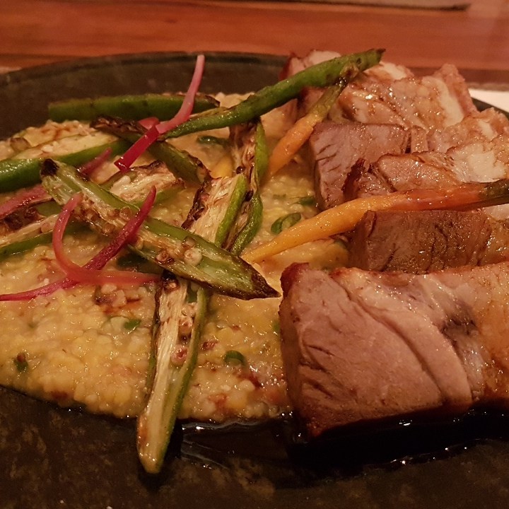 O filé suíno sobrecozido vem acompanhado de talharim ao molho de limão que não chega a ser molenga, mas também não oferece uma textura nitidamente ao dente. Acho que menos pelo cozimento e mais pelo refino da farinha, mais semolina talvez resolvesse. A barriga de porco também sobrecozida vem com canjiquinha que absorveu bastante caldo de vegetais, mas continua sem graça. O pato confitado e nhoque oferecem excelentes texturas e só. O lindo capeletti é recheado com um creme de abóbora não muito aboborento. Não são pratos ruins, apenas sem muito brilho, o mais longe que vão são a um molho de limão ou ao pato rosado.