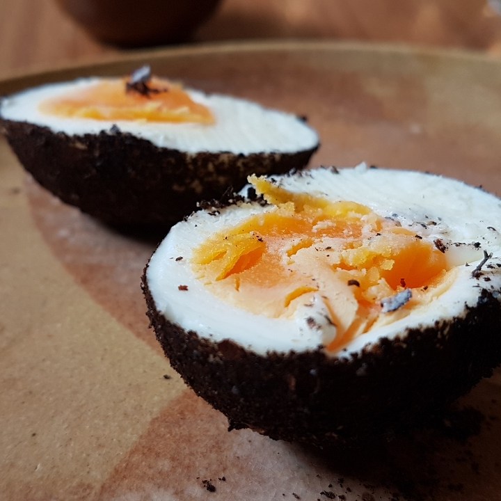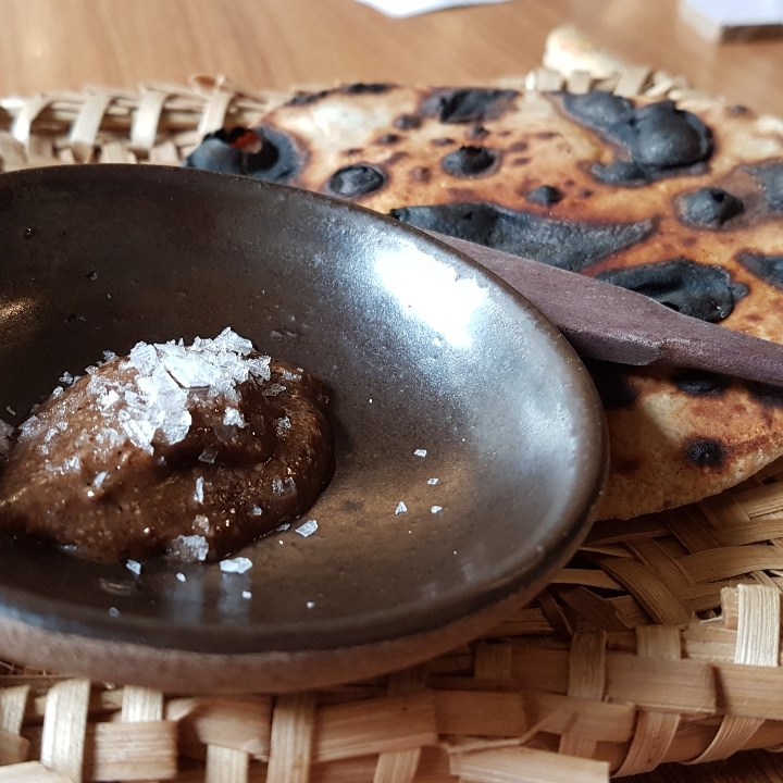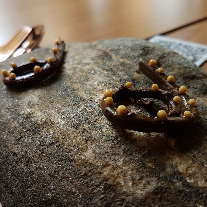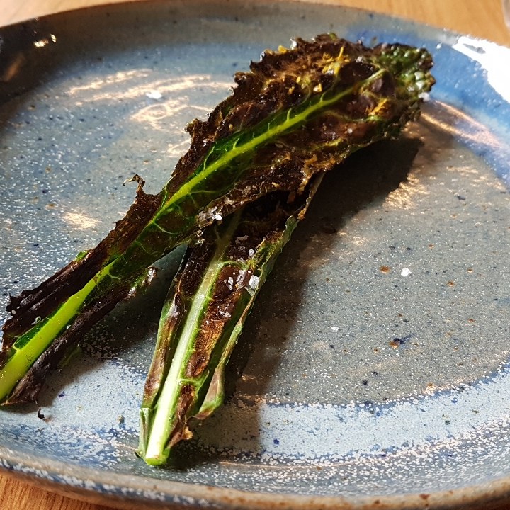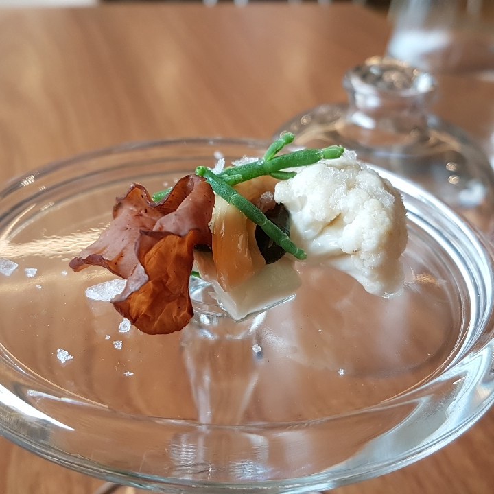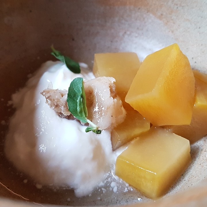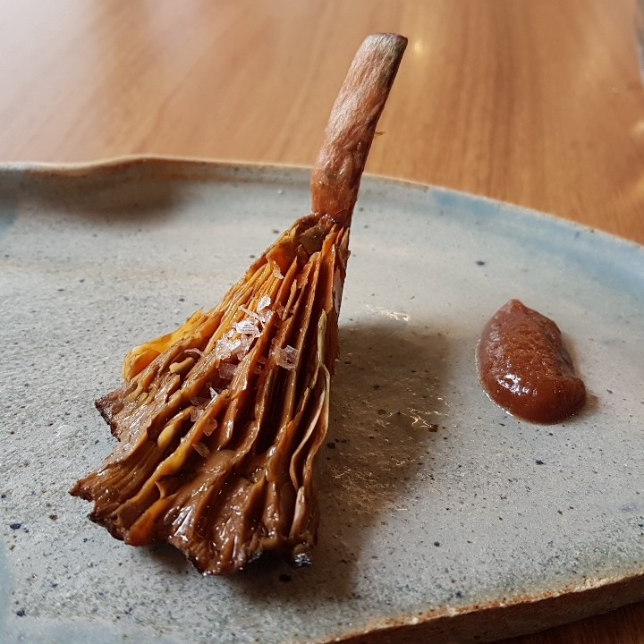 Entre os inusitados, temos broto de samambaia com sabor mazomenos do vinagre em que foi marinado; temos meio cogumelo selvagem super exótico, amargo, adstringente e químico-terroso; temos queijo de leite cru da casa com pólen de abelha tiúba e vinagrete com sabor de serragem. É super legal que brinquem com a nossa confiança, “será que é seguro comer isso?”, mas não acho que alguém fique feliz em comer. Entre os insossos, temos o bambu com azedinha, cebolinha assada e suco de pepino; temos os cubinhos de tubérculos com pasta supostamente de alho; temos de último salgado, auge da refeição, um ovo cozido gelado com sabor de ovo de codorna de boteco envolto em cebola queimada.