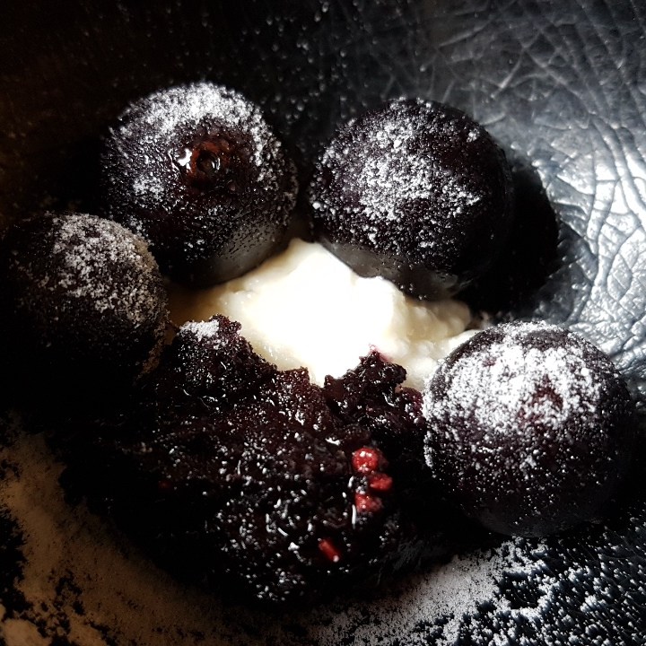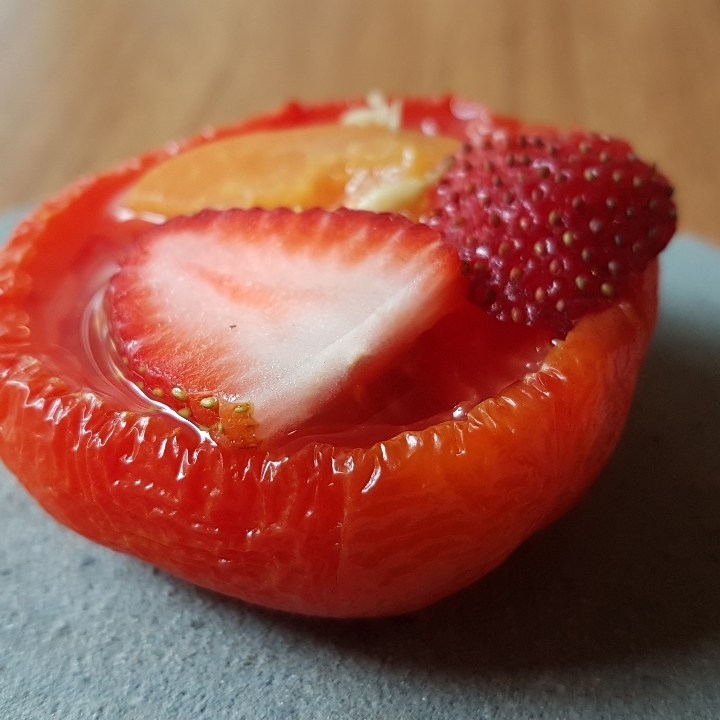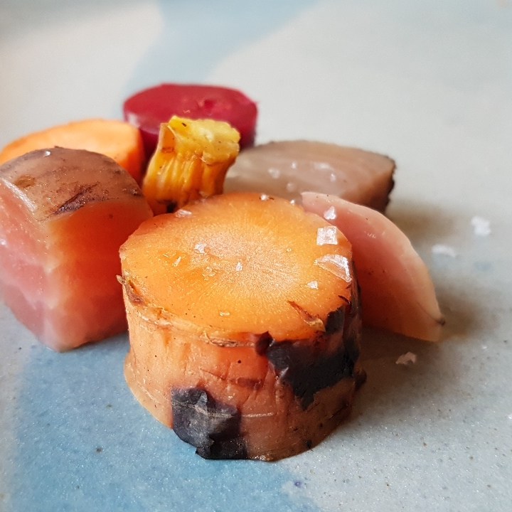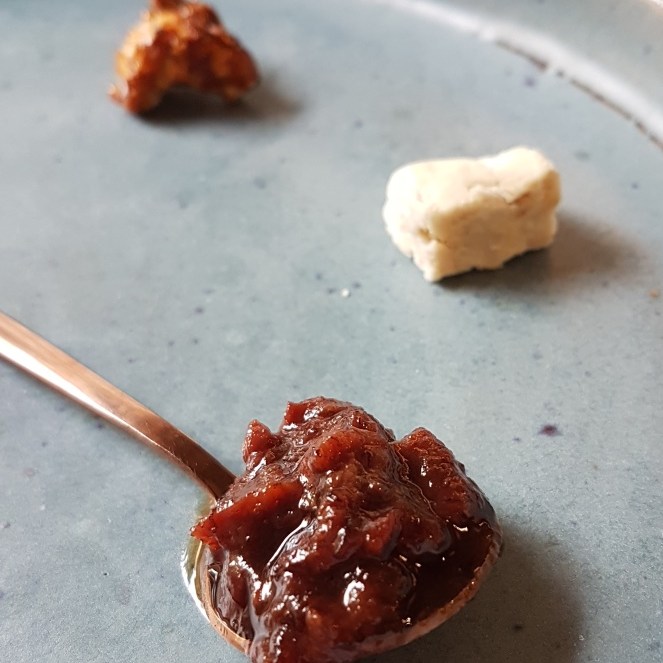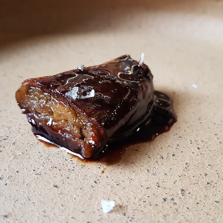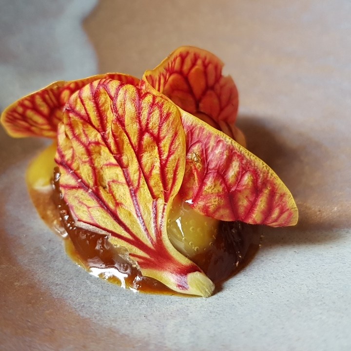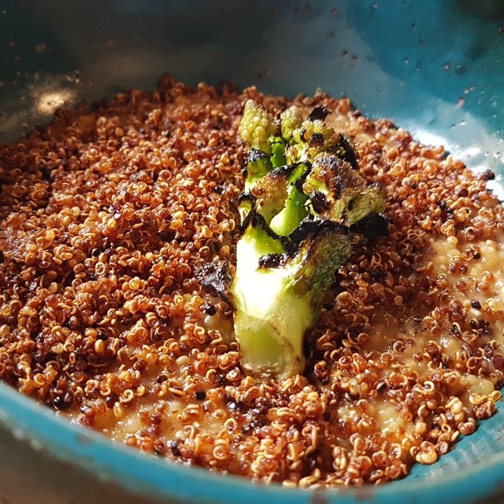 Alguns elementos eram bons, mas não suficientes para ser um prato, como o tomate morno com morango e nêspera, e a couve cavalonero extremamente salgada e monótona depois da primeira mordida. Viessem juntos, se destacariam, colocariam em contraste suculência e secura, frutado e verde, doçura e salgado. É o que fazem os pontos altos da degustação: a berinjela com demi-glace de cebola e pasta de gergelim, e a canjiquinha com tomate verde, brócolis romanesco e quinoa frita. Me vem à cabeça o Remy do Ratatouille explicando como os sabores do queijo e da uva explodem mais quando combinados. Seja por costume ou por motivo evolutivo, o modelo de pratos com dois ou três elementos complementares e porção maior que uma única mordida funciona. Que tal usarem?