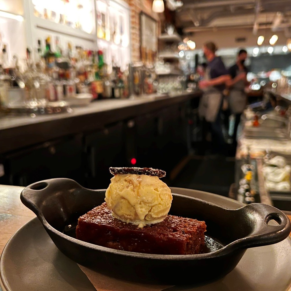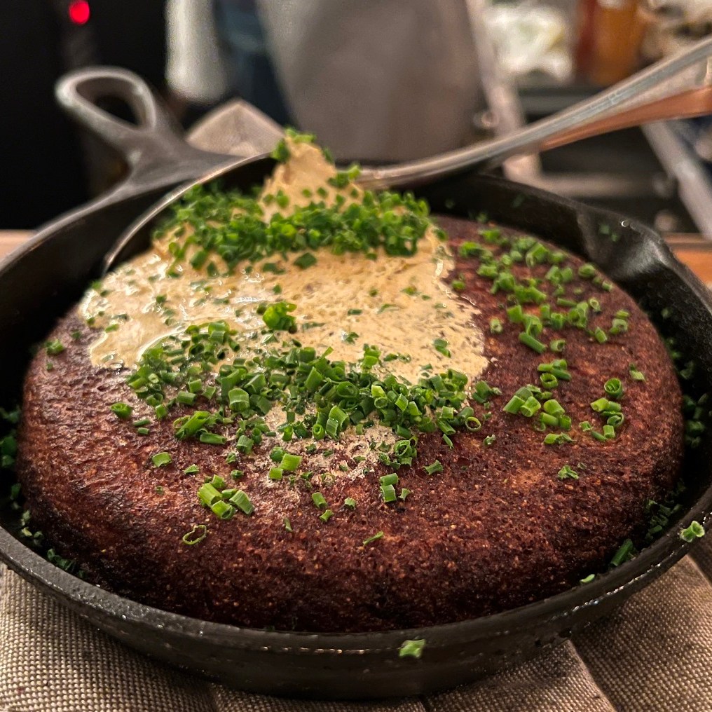 @thedabneydc faz um belo resgate da cozinha do Médio Atlântico, uma culinária espremida entre as referências do sul e do norte. Não é acaso que tenham escolhido construir a capital dos Estados Unidos nessa região, queriam justamente que ela recebesse influência dos dois pólos. Em termos culinários, significa que podemos começar a refeição no Dabney tanto com uma fatia de sourdough grelhada e defumada no fogo à lenha com manteiga, molasses e sementes de erva-doce, quanto com um monumental cornbread cerealoso, mais para centeio que milho, etéreo no meio e crostudo no fundo da panela de ferro.