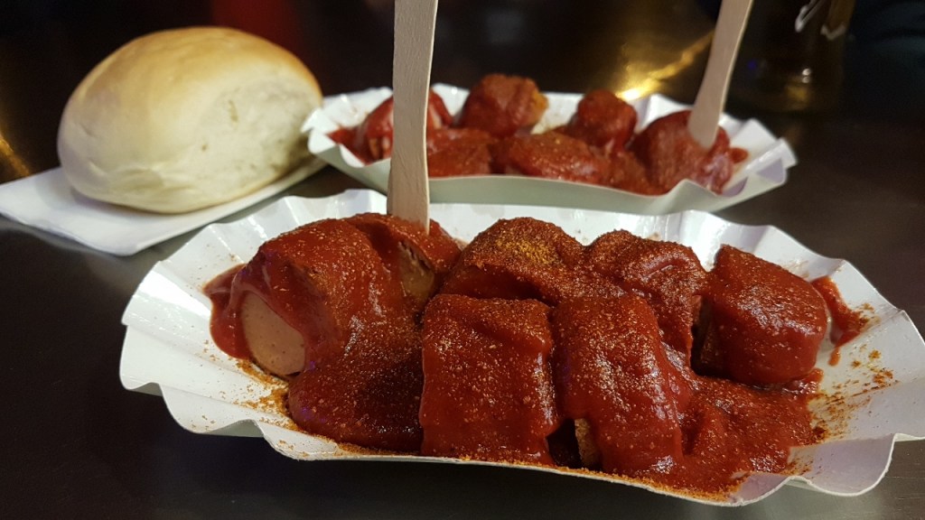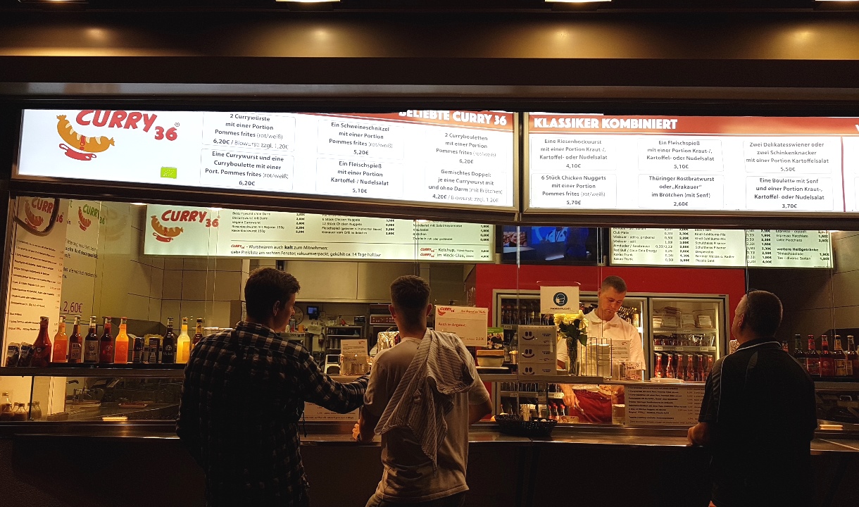 Por dentro, a coisa é diferente. Uma plaquinha bem discreta no fundo da loja avisa que fazem seus salsichões com porco orgânico. Em um mundo dominado por nós, hipsters, até estranha não ver isso alardeado como pompa e fanfarra, eles nem sequer cobram mais caro que ambulantes na rua (afinal, o custo da carne em si não deve passar de 10% do preço final). Talvez sejam discretos por medo do público-alvo achar ruim ser orgânico (sei lá, frescura), importante é ter o maior pedaço de carne pelo menor preço (no fim, metade do salsichão é ar). E mais, eles vendem salsichão vegetariano! Em outro lugar, chegamos até a ouvir “es ist keine Wurst”¹ quando perguntamos por currywurst vegetariano. Feito de proteína de soja ou qualquer outra coisa extrusada, o veg da 36 tem sabor de MDF (não que eu já tenha comido MDF) e retrogosto amarguinho. As texturas dos dois são bem parecidas, o que não é um elogio para a versão vegetariana, mas uma crítica para a animal.