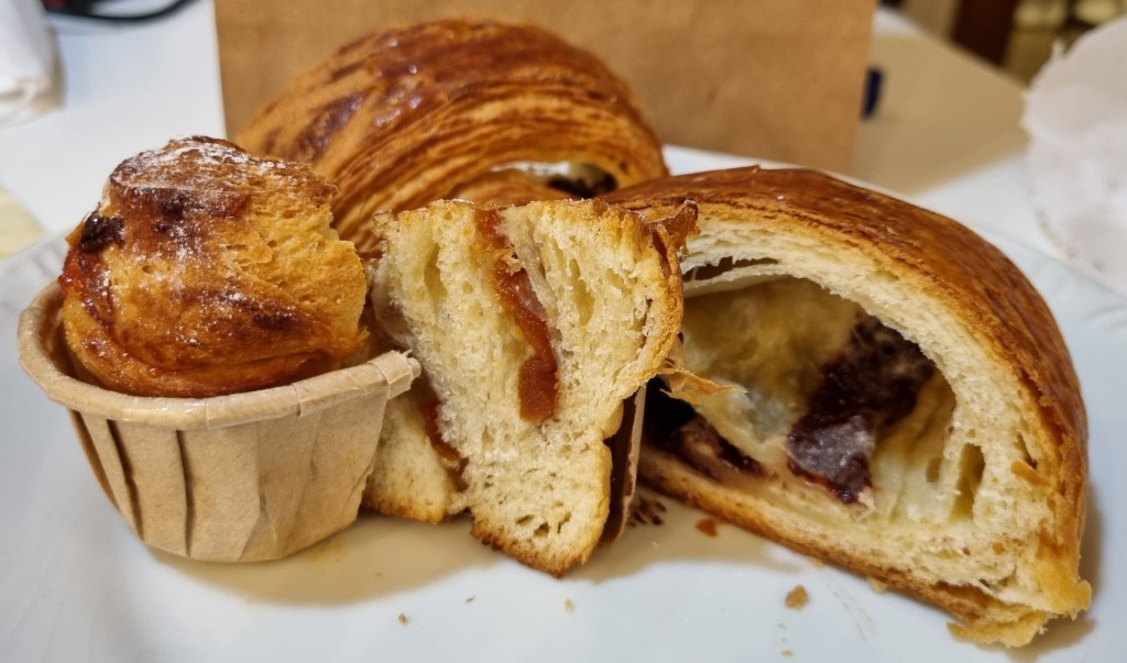 Quando chego esbaforido na loja às 15h55, meu irmão tinha acabado de passar e pegar a sacola. Imagina o meu ódio mortal duplo twist carpado ao comer, finalmente, o pão azedinho, mais bactérias que leveduras, bem aroma de levain vivo/cru, o que talvez seja meio enjoativo, aromas mais cerealosos e maillardentos seriam mais convidativos. Os alvéolos são pequenos e despretensiosos, um posicionamento contra a ditadura dos alvéolos grandes e farinhas fortes, destacando os grãos diferentões e antigos. A casca é fina e saborosa, tem cerealoso e algo a mais, bem único, um descritor não comum para pães que está na ponta da língua e não vem. As massas folhadas são boas mesmo que normalzinhas, meio sabor de pão com manteiga de padaria, alvéolos achatados, textura mais brioche que folhada. O rolinho de goiabada é insosso, massa sem graça particular, pouca goiabada. O chocolate @missionchocolate do pain au chocolat é, de fato, cheio de presença, aromático, ácido, frutado, intenso. Prova que, sim, é possível fugir do belga, mas, ao menos essa massa, não acrescenta ao chocolate.