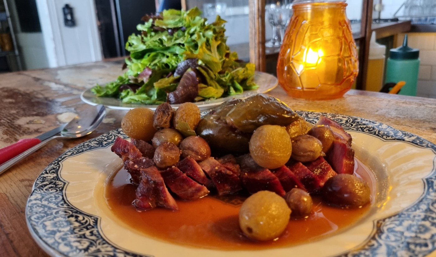 Enfim, não sei se a falha na comunicação foi minha ou dele, fiquei com a impressão de que o bartender me vendeu ovelha com batatas e eu recebi porco com figos e uvas. A cara estava boa, a inércia estava alta, aceitei a troca. O lombo estava impecavelmente braseado, mas eu devia ter vencido a inércia. O prato era natalino e doce demais para o que eu estava querendo comer, ainda mais depois de uma entrada também adocicada. De sobremesa, não tinha o bolo marjolaine, então tive de me contentar com um bolo de morango, ruibarbo e chantilly muito blasé. Achei curioso que a comida cumpra rigorosamente a proposta de imitar um bistrô francês, mesmos sabores, técnicas, ingredientes, alma. A diferença é que na França essa refeição custa €30-40, aqui custa CAD$130. Acho que faz sentido, manter algo fora do seu terroir costuma ser mais custoso.