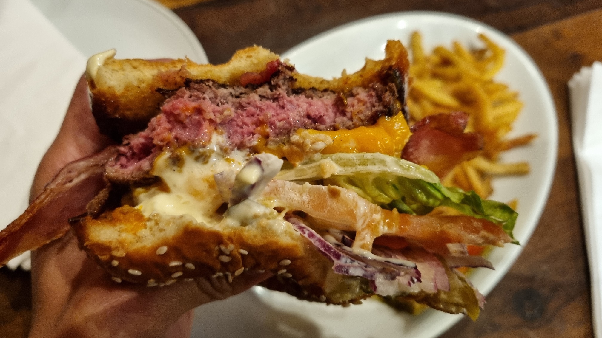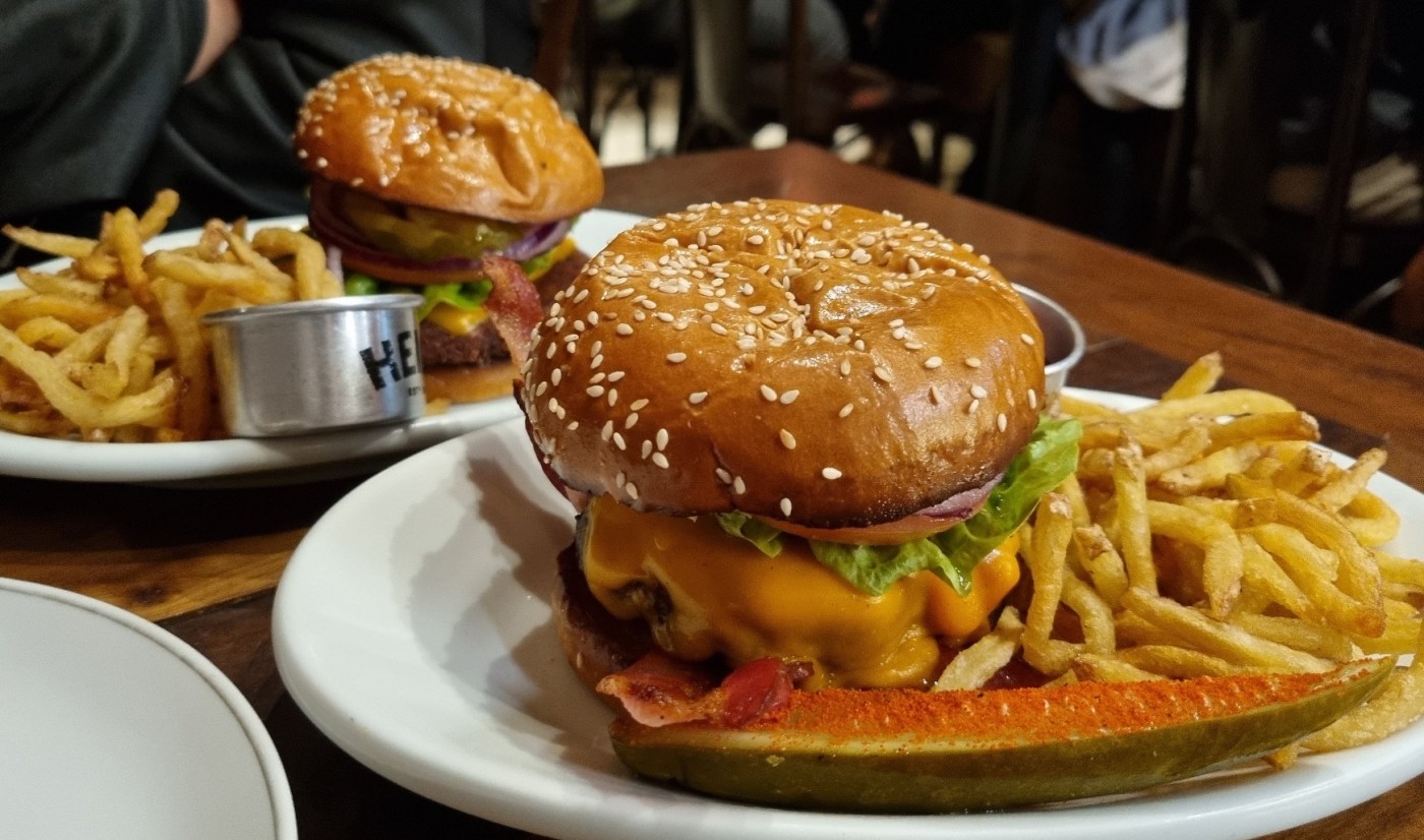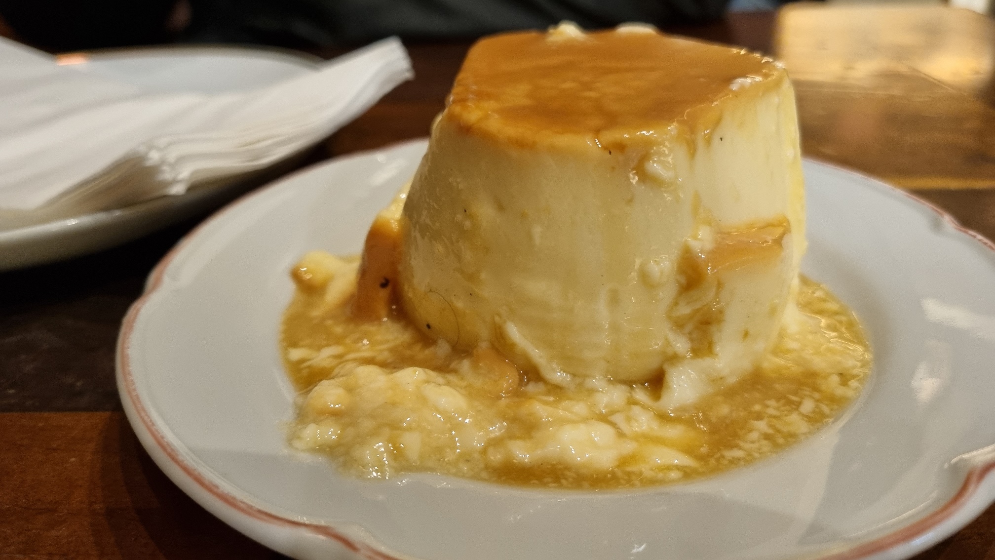 A crosta do hambúrguer do @holyburgersp é grossa, escura e crocante feito pé-de-moleque sem que a carne perca o ponto, o interior continua rosado. A salada e a maionese fartas nos ajudam a comer tanta crosta, evitam que o sanduíche fique seco e maçante no geral. O bacon é sequinho, crocante, salgadinho, defumado, bom. Achei as batatas feitas na casa também boas, fininhas, crocantes, um pouco mais salgadas do que eu consideraria ideal, mas nada impeditivo. Usam um cheddar melhorzinho, o que, curiosamente, deu num resultado pior, pesado, forte, enjoativo. Talvez fosse uma fatia mais fina? O falafel do @gustavotejerina é seco e sem graça, os outros elementos salvam o sanduíche dando umidade e sabor pro conjunto. Eu gostei do pudim com sabor de leite de coco e textura gorda e molinha que derrete fácil na boca. A comida é bem feita, só não é o tipo de lugar que eu frequentaria, no caso, uma hamburgueria burguesa gourmet top Heinz-Heineken que, com coerência, não é particularmente barata e envereda pelas gorgonzolas com cebola caramelizada e maioneses trufadas da vida.