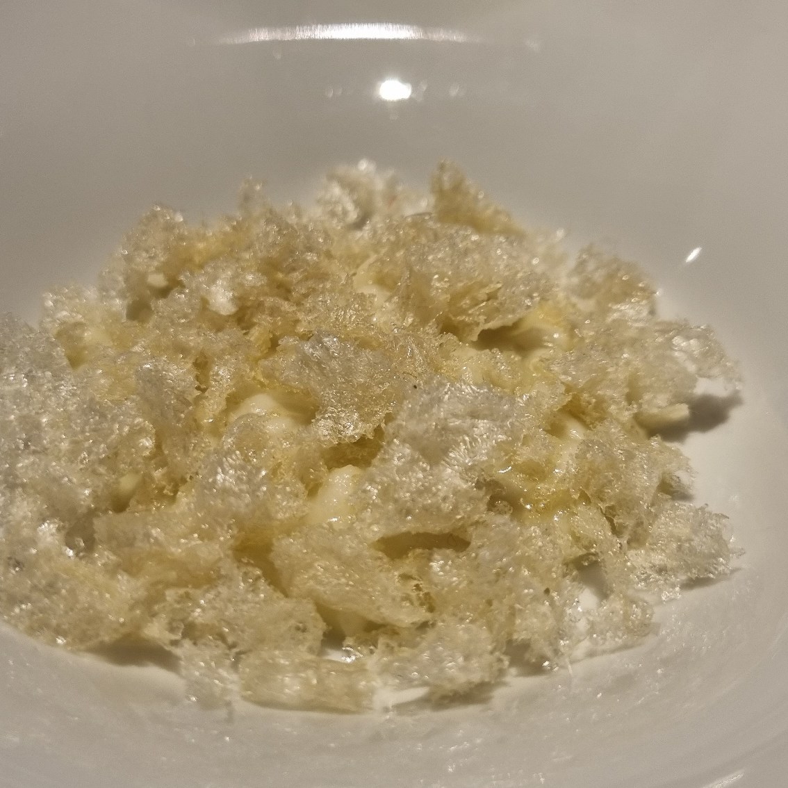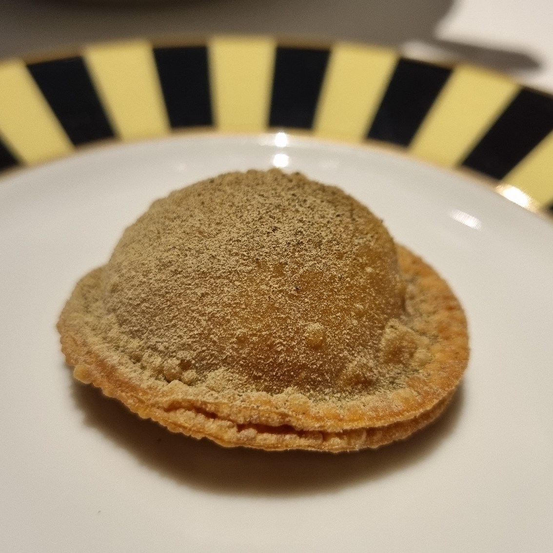 O salão é minimalista sem ser chique, as mesas tem puxadinhos (por que não têm mesas do tamanho adequado?), os fios dos abajures saem das tomadas expostas nas paredes e serpenteiam pelo chão, as taças insossas são de marcas diversas e aleatórias, as cortinas ficam fechadas (por que nos privar das ruas e do sol de Modena?), a luz forte e artificial cansa, ainda mais com as looongas esperas entre os pratos. O serviço é ruim ao ponto de eu pedir sugestão de vinho branco em taça, o sommelier sugerir um “typical white or an orange wine”, eu pedir que ele me contasse mais sobre os vinhos, ele ficar irritado e dizer ríspido: “one is typical white, the other is orange wine”. Haha. Sério, que absurdo. Infelizmente, a cozinha não compensa os problemas do salão, acho até que só de ver as fotos já dá para ver. Dá ou não dá?