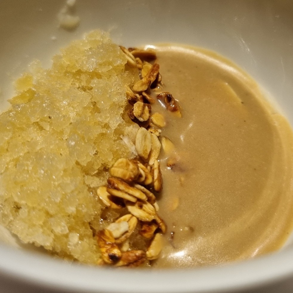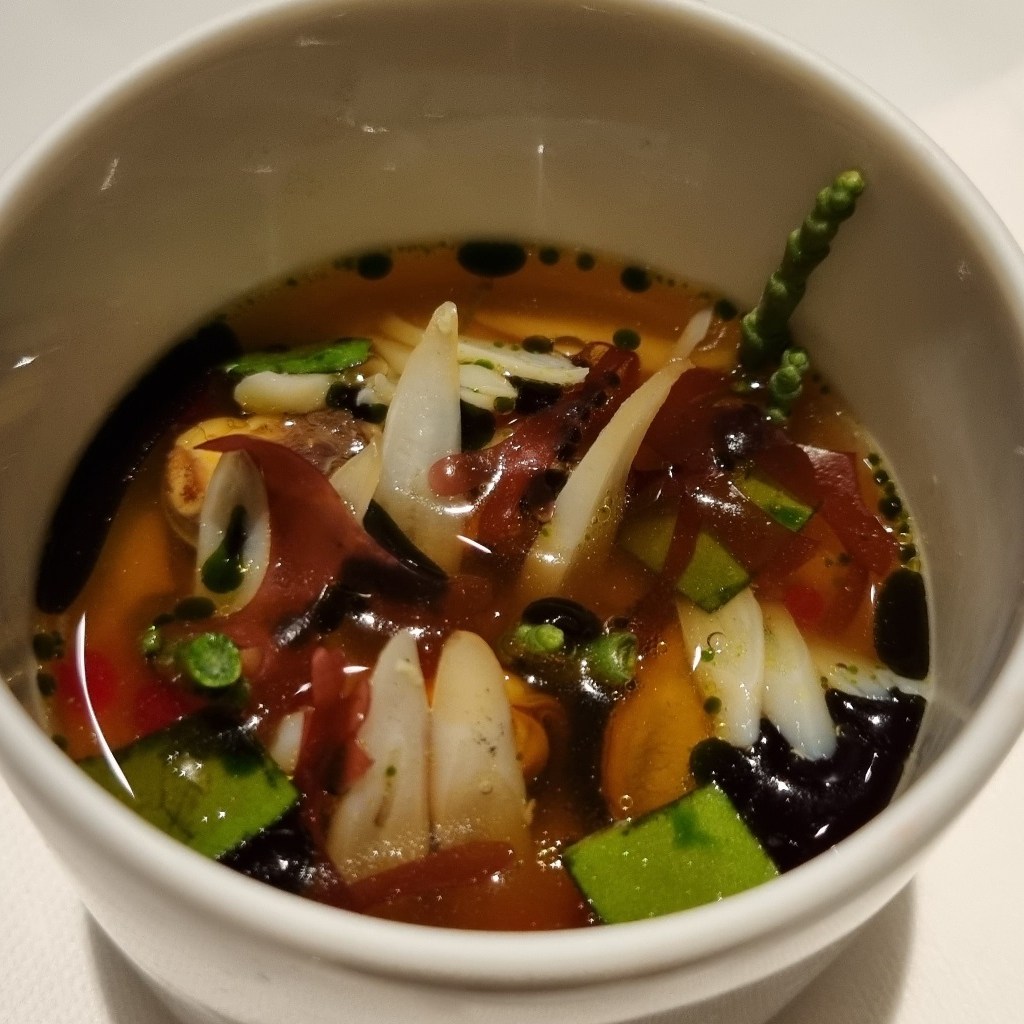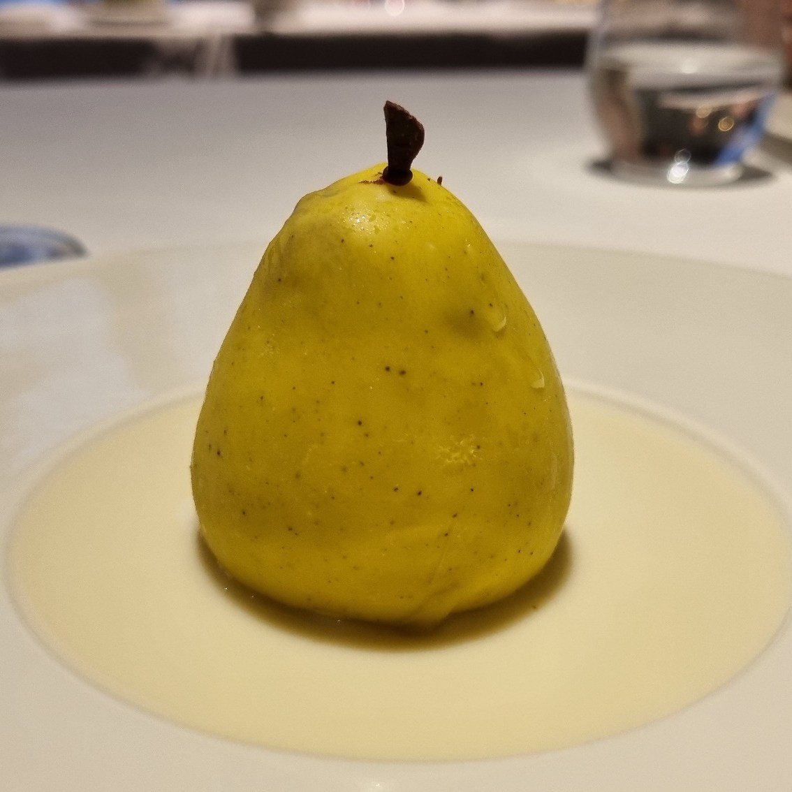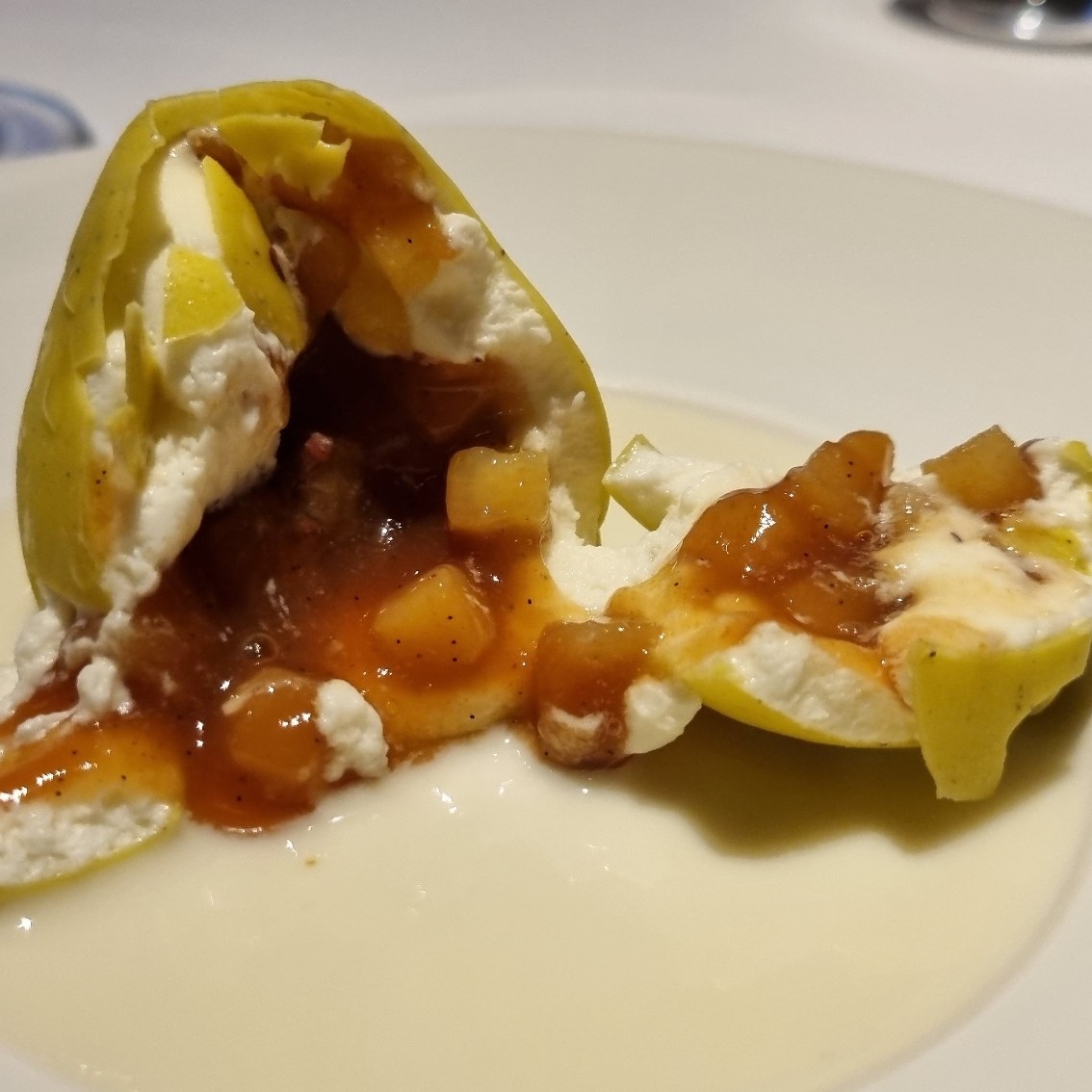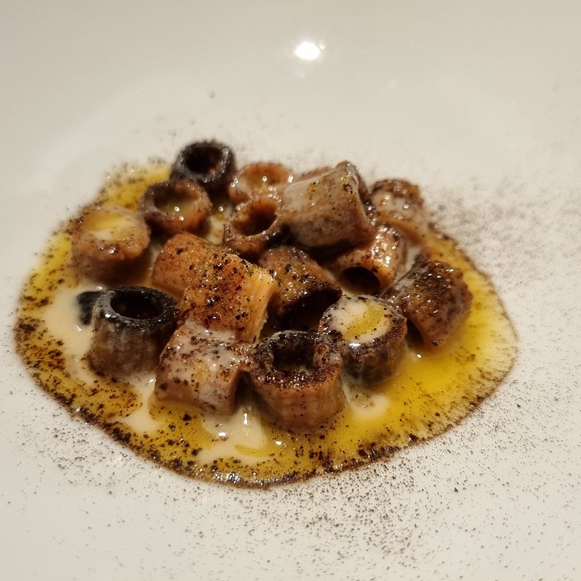 O menu dá largada com uma brincadeira: começar pela sobremesa. Adivinhem? Como sobremesas, as entradas são péssimas. Como entradas, são péssimas também. Exemplo: o panetone é rico, gordo e macio, mas doce demais, desaparece com a lentilha e a linguiça. Então pra que tem lentilha e linguiça? E aí, recomendam experimentar um pedaço e deixar o resto de lado para ir comendo como pão porque não vai ter pão. Cara… traz uma porra de uma cesta de pães linda, diversa, estalando de fresco. Isso é ou não é o melhor restaurante do mundo 2016 e 2018? Esse panetone é doce e gorduroso demais para ser pão, sabe? Tenta ser entrada-sobremesa-pão e é péssimo como entrada, como sobremesa e como pão.